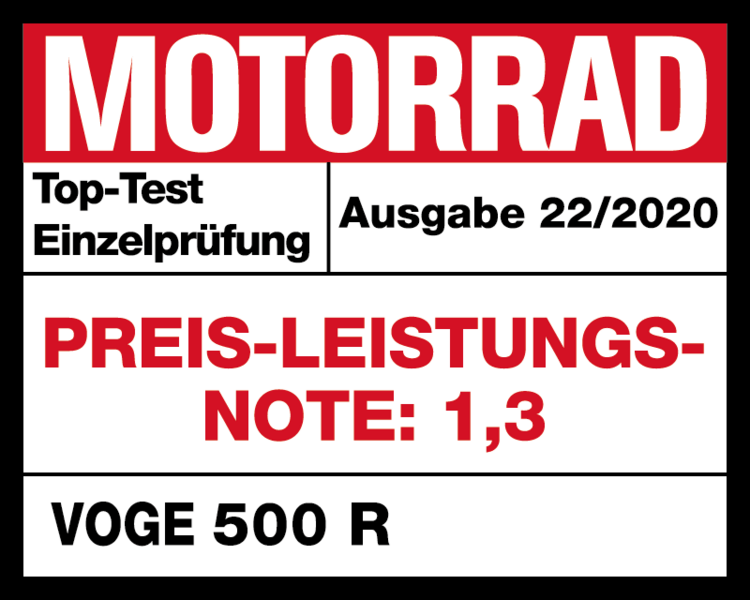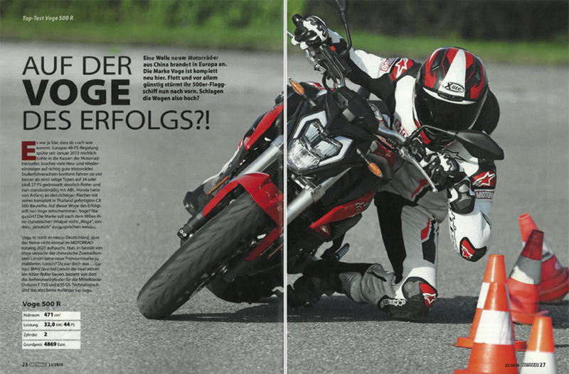 Unter dem Titel "Auf der VOGE des Erfolgs?" ist in der aktuellen Ausgabe (Nr. 22 / 2020) der Zeitschrift MOTORRAD ein Testbericht zur VOGE 500 R erschienen. Dort wurde das "China Bike" auf Herz und Nieren geprüft und streicht großes Lob beim Handling, der Verarbeitung und der Alltagstauglichkeit ein. Als Preis-Leistungs-Note erhält die VOGE 500 R die 1,3!